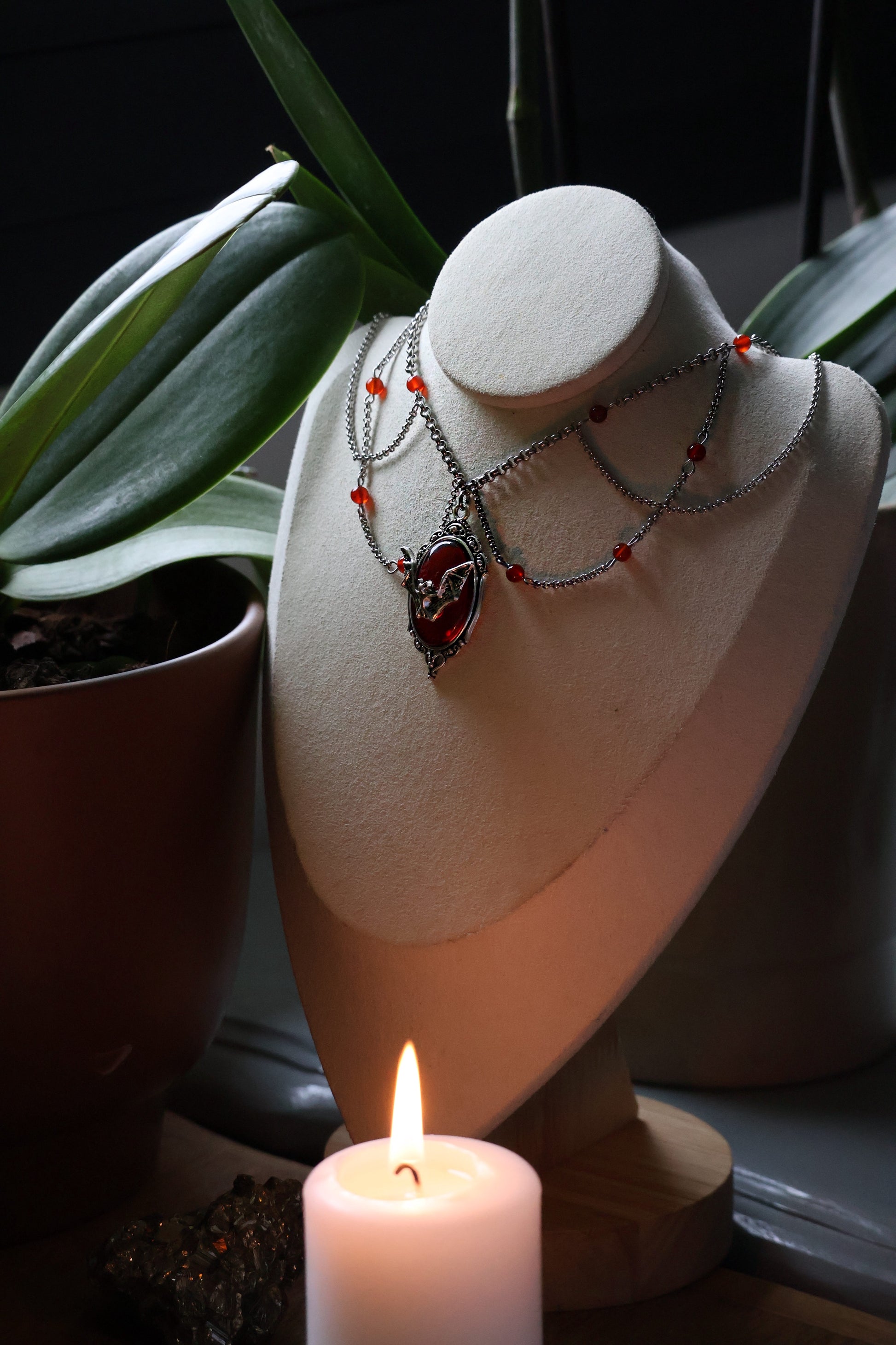 Deux mondes s’y affrontent : le feu rouge de la cornaline, symbole de vitalité et de désir, et le noir profond de l’obsidienne, gardienne du silence et de la vérité cachée.